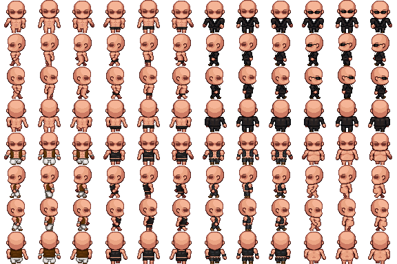 浅黒い肌で、筋肉質で(1つは…ふくよか)、目元が影で、頭髪は省略されたモブ